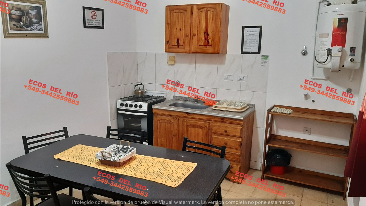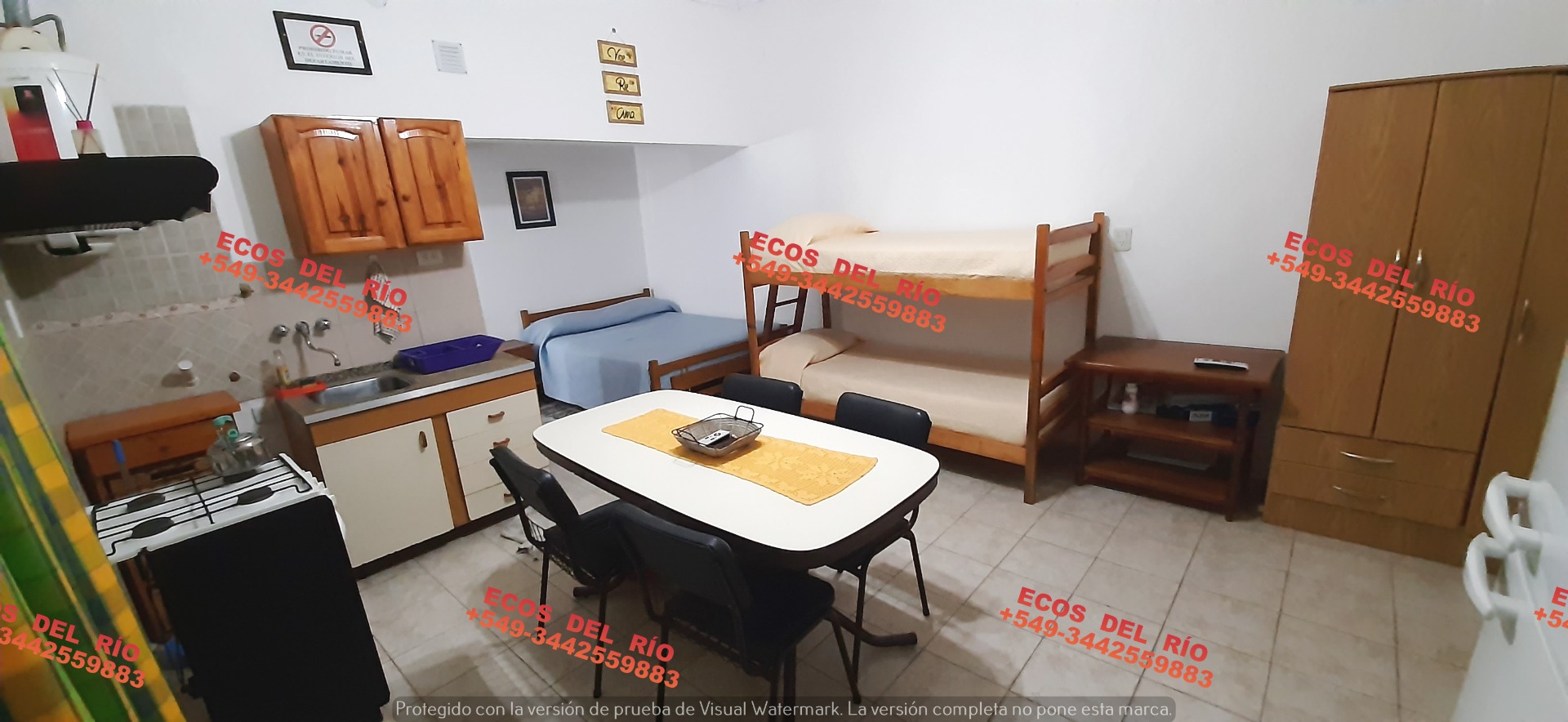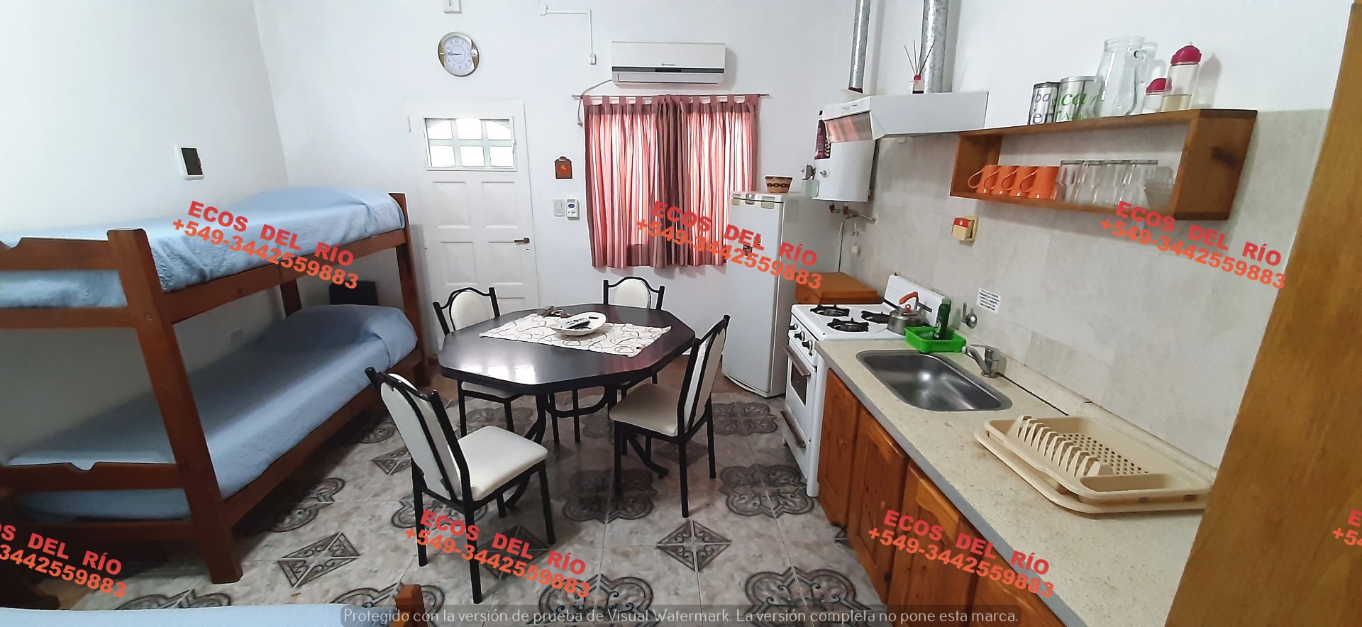 Se encuentra equipado con una cama doble matrimonial, baño privado, vajilla, heladera, cocina con horno, extractor de aire, calefacción, aire acondicionado, ventilador de techo, placard, televisor lcd de 24 pulgadas, mesa y sillas.