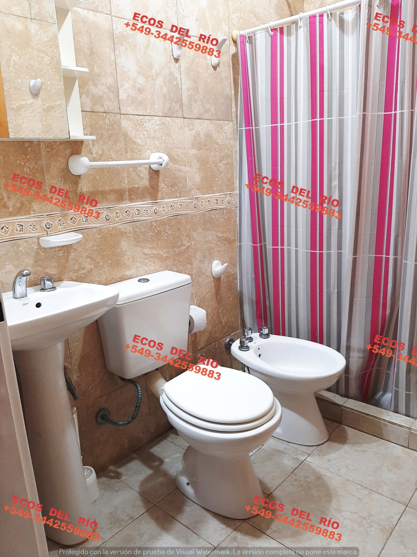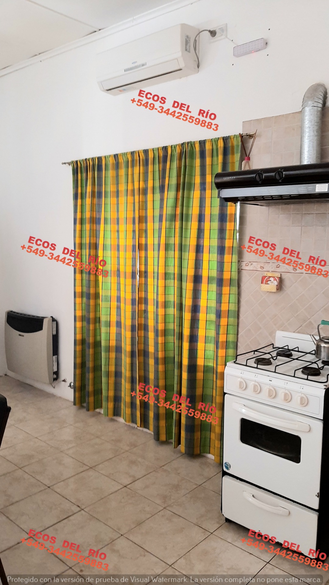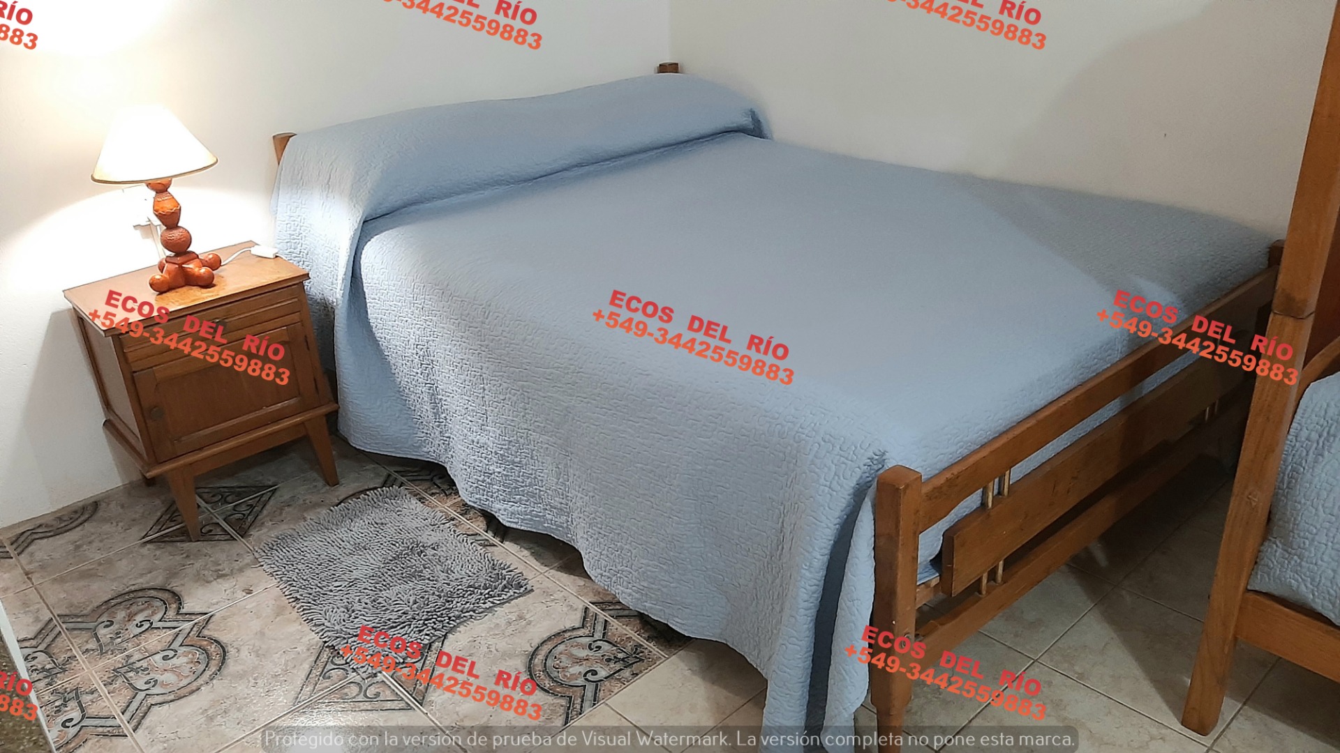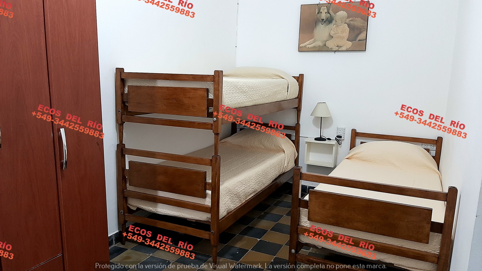 Se encuentra equipado con una cama doble matrimonial, una cucheta y una cama individual, baño privado, vajilla completa, heladera con freezer, cocina con horno, calefacción, aire acondicionado en dormitorio, dos ventiladores de techo, placard, televisor lcd de 32 pulgadas, mesa y sillas.